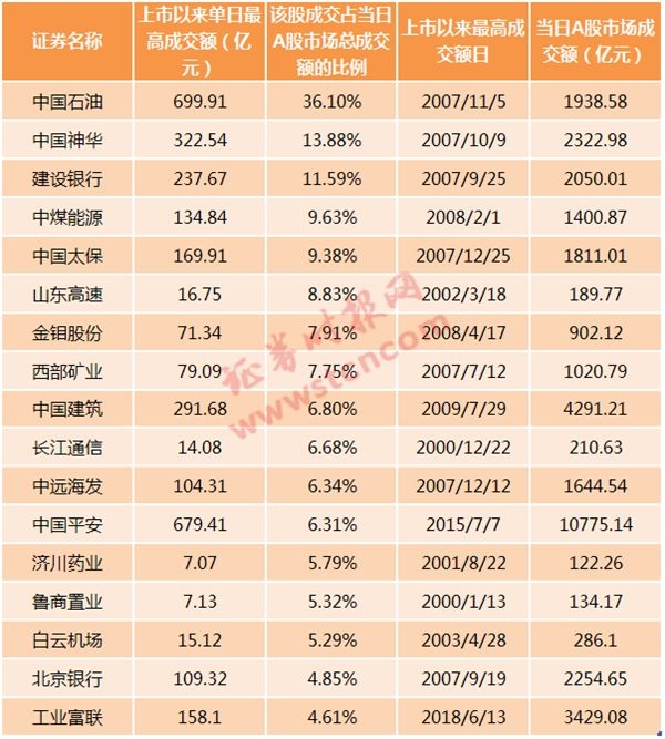 A股史上也有个股成交对市场“抽血”效应比较严重的现象,以新股上市初期的情形居多,最为典型的要属中国石油A股上市首日。