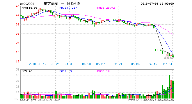 7月2日,东方雨虹放量跌停收15.31元/股,当日成交量达40.14万手,创该股今年以来单日最高成交量。长期来看,截至7月4日收盘,东方雨虹今年以来股价下挫37.24%。对于东方雨虹而言,股价的下挫或许不仅仅是公司市值下行这么简单。东方雨虹控股股东股份质押以及公司可转债转股事宜均因市场的下挫出现不确定性因素。