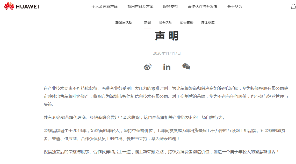 中证网讯(记者 张兴旺)11月17日,华为官网发布声明称,在产业技术要素不可持续获得、消费者业务受到巨大压力的艰难时刻,为让荣耀渠道和供应商能够得以延续,华为投资控股有限公司决定整体出售荣耀业务资产,收购方为深圳市智信新信息技术有限公司。对于交割后的荣耀,华为不占有任何股份,也不参与经营管理与决策。