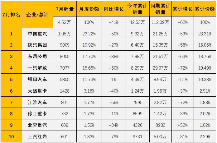 图片说明:2022年7月重型卡车(含底盘、牵引车)市场销量表(单位:辆) 来源:中汽协