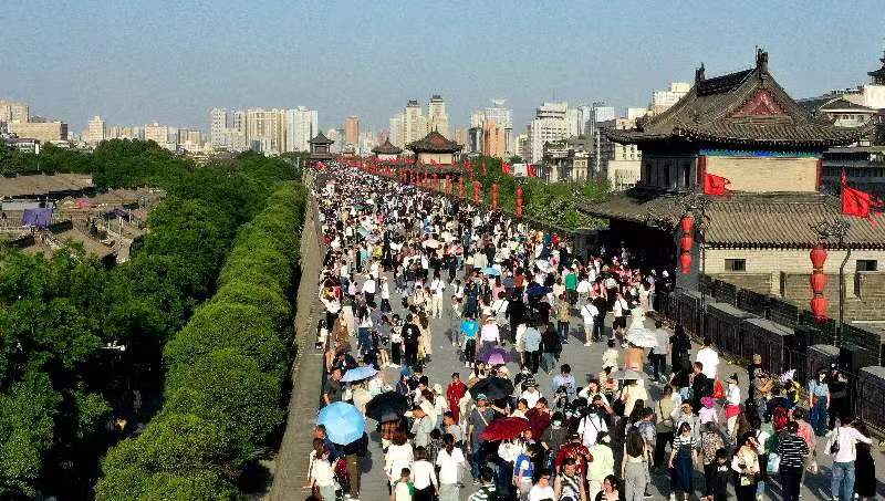 4月30日,游客在西安城墙景区参观游览(无人机照片)。 新华社图片