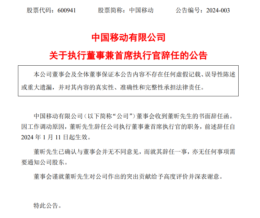 1月11日,中国移动发布公告称, 董昕因工作调动原因辞任公司执行董事兼首席执行官的职务,自1月11日起生效。董事会同时宣布,李荣华已获委任为公司的一名授权代表,以填补因董先生辞任而产生之空缺,自1月11日起生效。