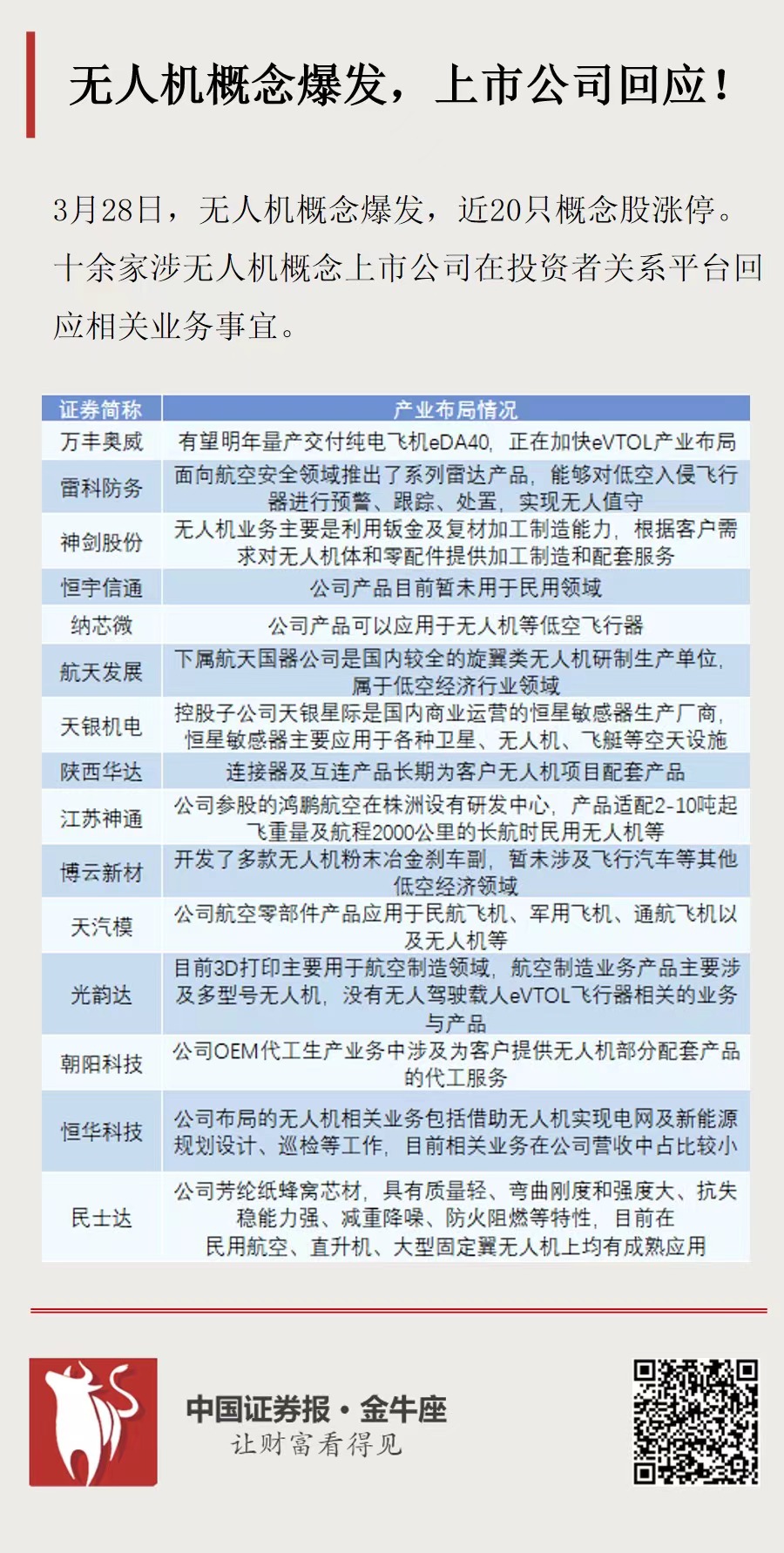 3月28日,低空经济概念股全面爆发,近50股涨停或涨超10%。其中,无人机成低空经济炒作分支,近20只概念股涨停。十余家上市公司在投资者关系平台回应相关业务事宜。
