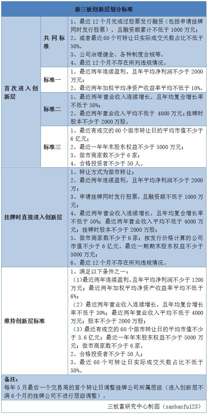 股转的分层文件指出,创新层公司想继续留下,除了必须继续满足之前的三个标准其中之一外,还必须同时满足两个共同标准:合格投资者不少于50人、最近60个转让日实际成交天数占比不低于50%。
