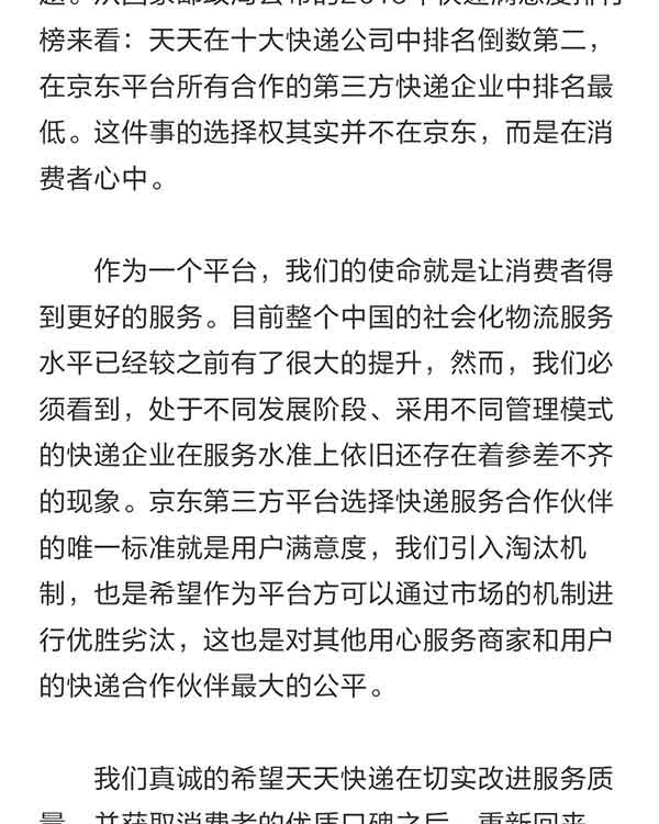 在这篇回应文章中,京东方面再次解释了与暂停与天天的合作原因。“因为每天我们的客服和商家都能收到大量消费者的投诉,反馈天天快递时效和服务质量问题。从国家邮政局公布的2016年快递满意度排行榜来看:天天在十大快递公司中排名倒数第二,在京东平台所有合作的第三方快递企业中排名最低。这件事的选择权其实并不在京东,而是在消费者心中。”京东物流发言人表示。