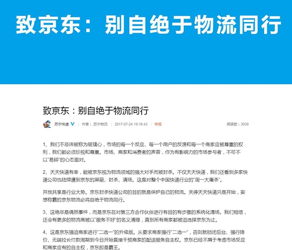 苏宁快递官方微博发表《致京东:别自绝于物流同行》