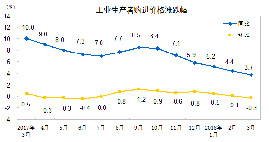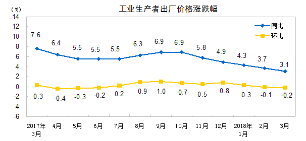 2018年3月份,全国工业生产者出厂价格同比上涨3.1%,环比下降0.2%。工业生产者购进价格同比上涨3.7%,环比下降0.3%。一季度,工业生产者出厂价格同比上涨3.7%,工业生产者购进价格同比上涨4.4%。