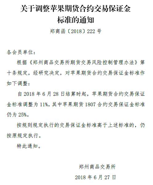 首页>首页>中证快讯 郑商所:28日起苹果期货合约交易保证金标准调整为11% 中国证券报·中证网2018-06-27 17:01 中证网讯(记者 陆静) 郑商所网站6月27日发布通知称,自2018年6月28日结算时起,苹果期货合约交易保证金标准调整为11%,其中苹果期货1807合约交易保证金标准仍为25%。