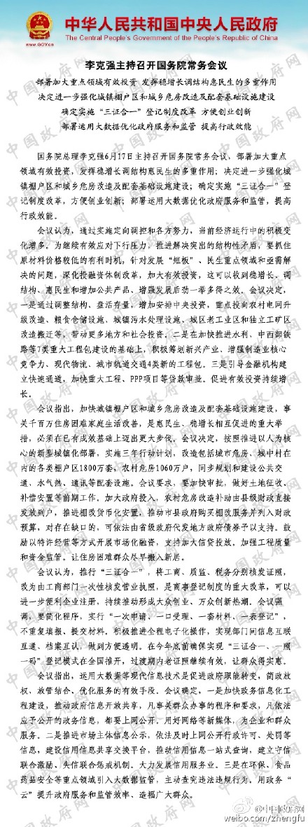 中国政府网消息,李克强6月17日主持召开国务院常务会议,部署加大重点领域有效投资,发挥稳增长调结构惠民生的多重作用;决定进一步强化城镇棚户区和城乡危房改造及配套基础设施建设;确定实施“三证合一”登记制度改革,方便创业创新;部署运用大数据优化政府服务和监管,提高行政效能。