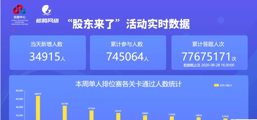 中证网讯(记者 周松林)据中证中小投资者服务中心8月28日消息,《股东来了》2020投资者权益知识竞赛正如火如荼开展中,自2020年8月10日下午3:30正式启动,到8月28日下午4:30,赛程尚未及半,但注册参赛人数已超过去年网络初赛的74.33万,达到74.5万;累计答题人次近7800万,也远超去年同期水平。