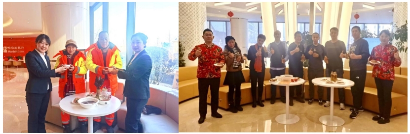 左图:环卫工人在厅堂内品尝腊八粥,右图:为参加活动的客户提供哈尔滨特色美食