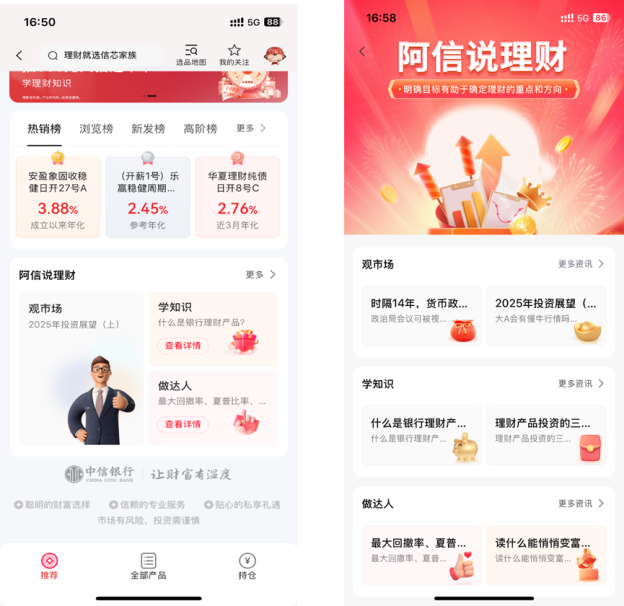 为践行金融为民服务宗旨,履行国有金融机构为民服务使命责任,在2020年理财业务净值化转型初期,中信银行已开始在手机银行APP线上主渠道,开设了“阿信说理财”栏目,对理财产品新知识和投资技巧进行投教宣传。随着净值化转型过渡期结束,中信银行APP功能也不断升级,引入了理财公司“幸福号”商铺,上线了资讯频道功能,进一步打通了投教内容运营体系。2024年,中信银行线上投教阵地“阿信说理财”迎来了全面升级,实现了基础知识与实时资讯相结合、一个内容体系与多点输出相结合、文字内容与声频、音频多媒体内容相结合、知识传播与线上投教活动相结合的理财投教运营机制。