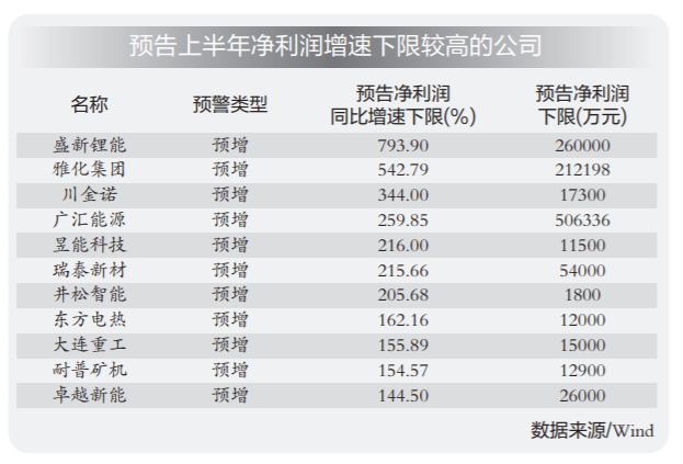 盛新锂能和雅化集团预计净利润增速下限均超过500%,是已披露业绩预告的公司中净利润增速最快的。其中,盛新锂能预计上半年净利润同比增长793.90%-897.04%,预计实现净利润26.00亿元-29.00亿元;雅化集团预计上半年净利润同比增长542.79%-618.52%,预计实现净利润21.22亿元-23.72亿元。