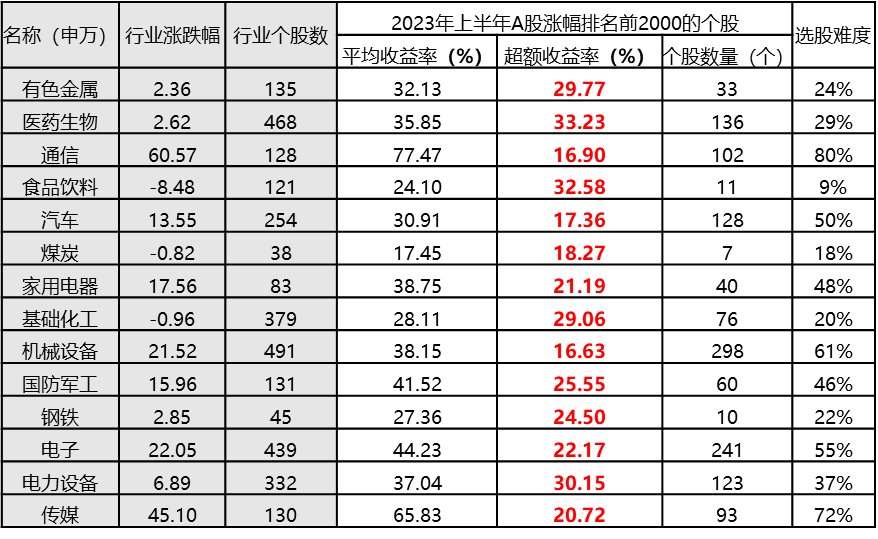 数据来源:wind,富荣基金,统计时间2023年1月1日-2023年6月30日。超额收益率计算方法:选出2023年上半年A股涨幅前2000的个股,按照申万一级行业分类后,计算其中对应各行业的平均涨幅,减掉行业指数的涨幅,为超额收益率。表格内容仅用于说明个股与行业整体的市场表现存在差异,不构成任何投资推荐。市场过往表现不预示未来,市场有风险,投资需谨慎。