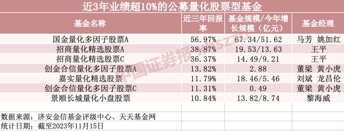与此同时,济安金信基金评价中心统计数据显示,截至11月15日,全市场共有公募股票型量化基金108只,成立一年以上的有106只,成立三年以上的有53只。其中,近三年回报率超过10%的共有7只。
