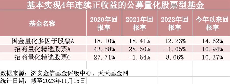 上述3只产品,也基本实现了近四年连续正收益。具体看来,国金量化多因子股票A自2020年以来的业绩每年均超过12%,更在今年实现了超14%的高收益。招商量化精选股票A和招商量化精选股票C仅在2022年略亏,在其余年份均实现了正收益。