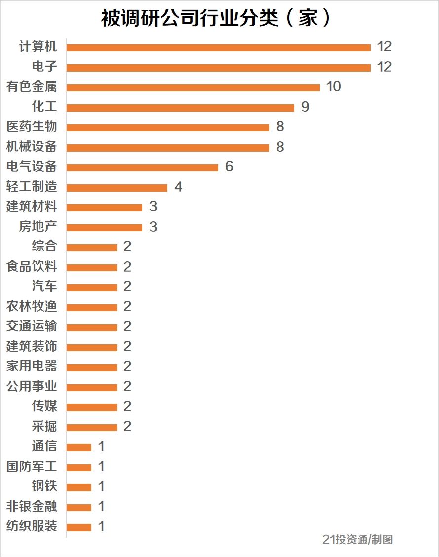 此外,有色金属、化工、机械设备、医药生物行业均有8家或以上相关公司被调研。