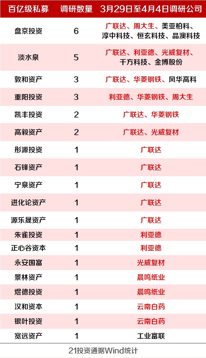 其中,盘京投资最为积极,调研了6家公司,含2家芯片股公司淳中科技、恒玄科技,与淡水泉、敦和资产等9家百亿私募共同调研了广联达,而重阳投资、淡水泉等4家百亿私募则调研了利亚德,此外,光威复材、华菱钢铁也获得3家百亿私募的青睐。