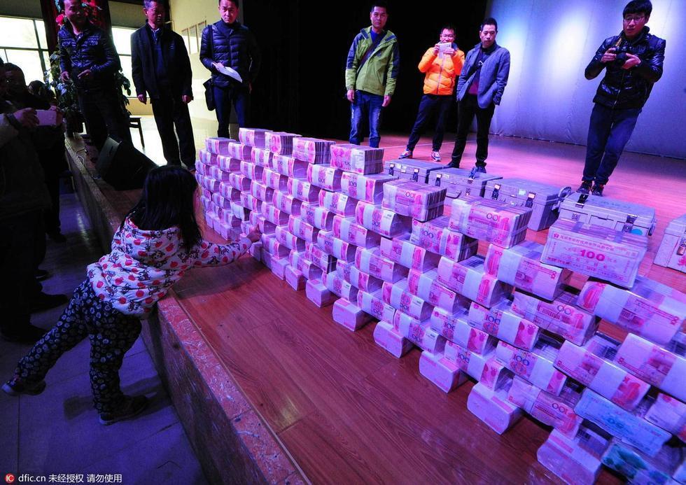 昆明村子当众分红1000万 现金堆“钱山”