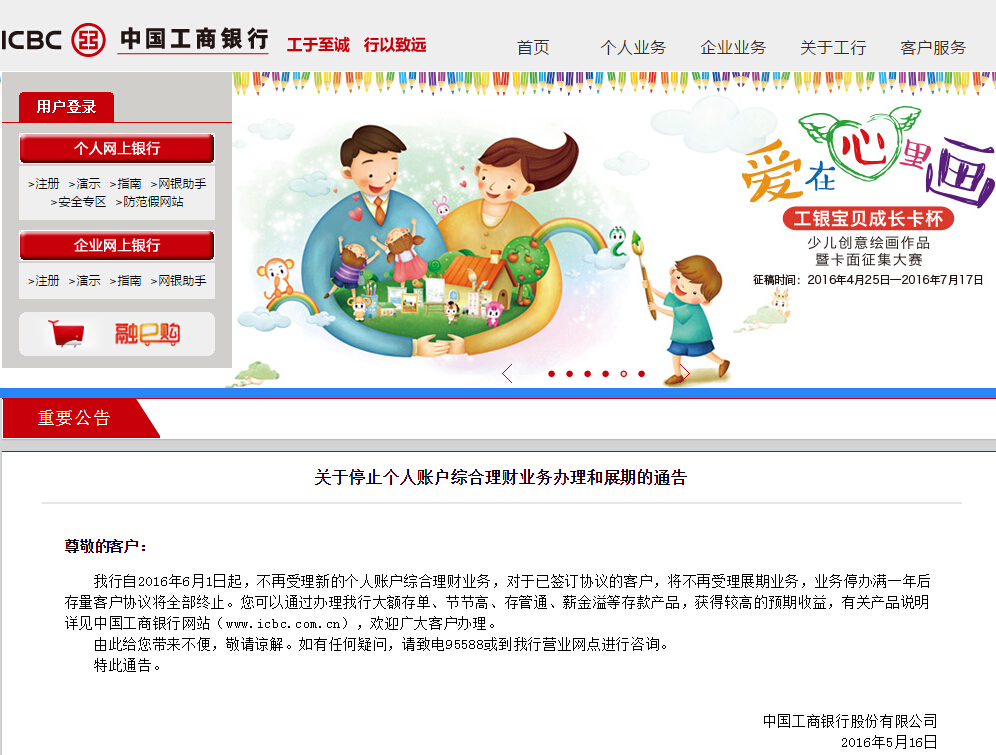 中国证券网讯 中国工商银行官方网站5月16日发布关于停止个人账户综合理财业务办理和展期的通告。通告指出,工行自2016年6月1日起,不再受理新的个人账户综合理财业务,对于已签订协议的客户,将不再受理展期业务,业务停办满一年后存量客户协议将全部终止。