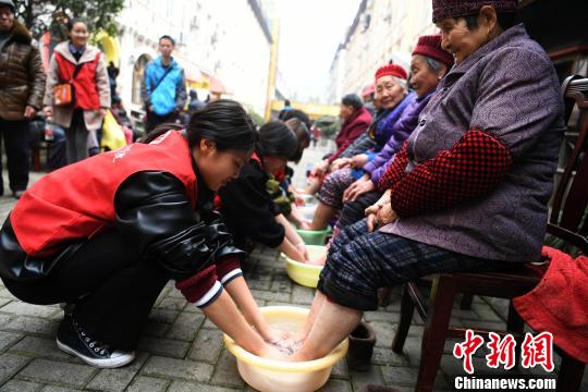 资料图:志愿者为老人们洗脚。 陈超 摄