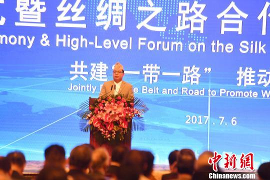 图为尼泊尔副总统南德·巴哈杜尔·普恩作主旨演讲。 杨艳敏 摄