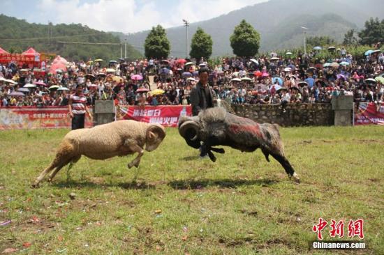资料图:7月17日,一年一度的凉山火把节隆重开幕。当日,在四川省凉山州西昌市安哈镇举行的斗牛斗羊大赛吸引了众多当地群众和外地旅游者目光,火爆刺激的比赛引得众人纷纷拍手叫好。王哲 摄