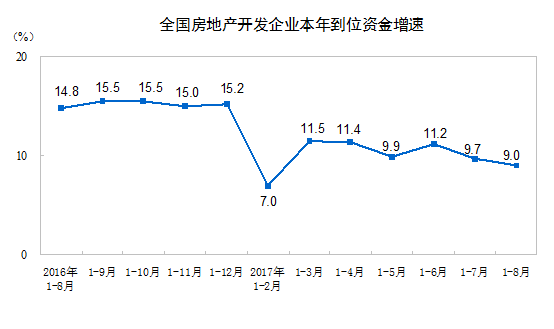 1-8月份,房地产开发企业到位资金99804亿元,同比增长9.0%,增速比1-7月份回落0.7个百分点。其中,国内贷款16904亿元,增长19.0%;利用外资112亿元,增长15.4%;自筹资金31439亿元,下降1.7%;其他资金51349亿元,增长13.4%。在其他资金中,定金及预收款30786亿元,增长20.0%;个人按揭贷款15764亿元,增长2.4%。
