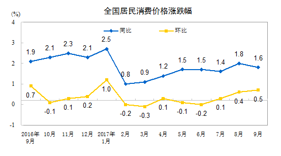 2017年9月份,全国居民消费价格同比上涨1.6%。其中,城市上涨1.7%,农村上涨1.4%;食品价格下降1.4%,非食品价格上涨2.4%;消费品价格上涨0.7%,服务价格上涨3.3%。1-9月平均,全国居民消费价格总水平比去年同期上涨1.5%。