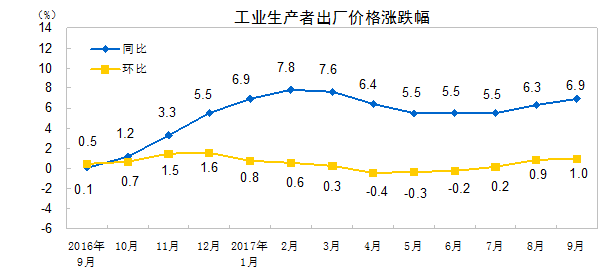 2017年9月份,全国工业生产者出厂价格同比上涨6.9%,环比上涨1.0%。工业生产者购进价格同比上涨8.5%,环比上涨1.2%。1-9月平均,工业生产者出厂价格同比上涨6.5%,工业生产者购进价格同比上涨8.4%。