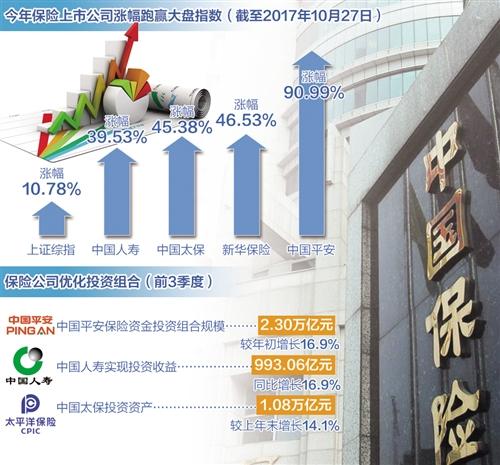 又到上市公司发布三季报时节。数据显示,保险类上市公司业绩相当出色。10月27日,中国人寿率先向市场公告,预计前3季度归母公司的净利润同比增长为95%;当晚,中国平安报告显示,前3季度中国平安实现归母公司股东净利润663.18亿元,同比增长17.4%。若剔除2016年上半年普惠重组利润94.97亿元影响,同比增长为41.1%。随后发布三季报的新华保险和中国太保,业绩也各有亮点。