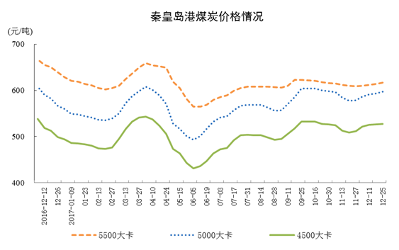 截至12月底,秦皇岛5500大卡煤炭平仓价617元/吨,比11月底上涨8元/吨;5000大卡597元/吨,上涨19元/吨;4500大卡527元/吨,上涨15元/吨。