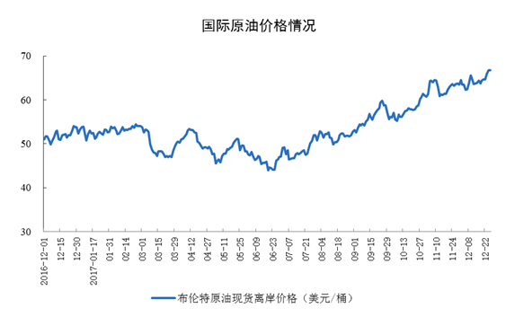 原油价格持续回升。12月份,布伦特原油现货离岸价格整体保持上涨趋势。截至12月29日,价格为66.7美元/桶,比11月底上涨3.2美元/桶。