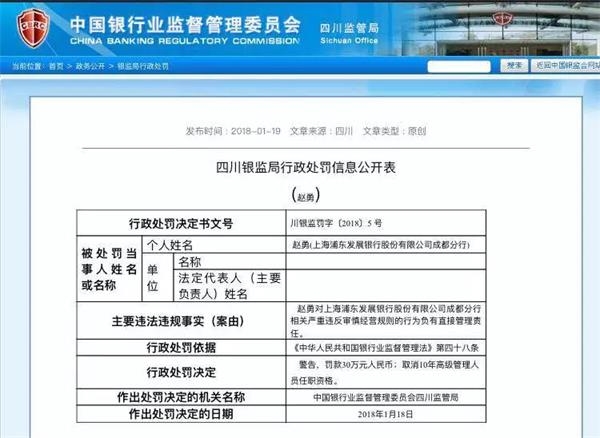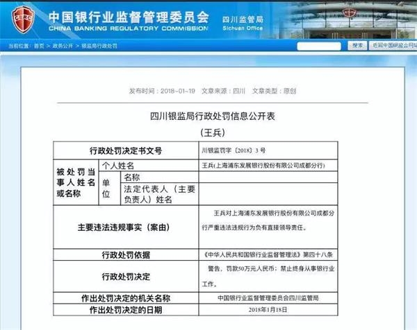 1月19日,银监会公布依法查处浦发银行成都分行违规发放贷款案件。四川银监局公布对浦发银行成都分行案做出处罚,共罚没4.62亿元,原浦发成都分行行长王兵被“双开”。