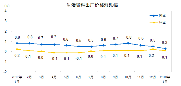 2018年1月份,全国工业生产者出厂价格同比上涨4.3%,环比上涨0.3%。工业生产者购进价格同比上涨5.2%,环比上涨0.5%。
