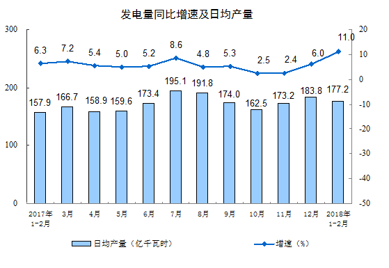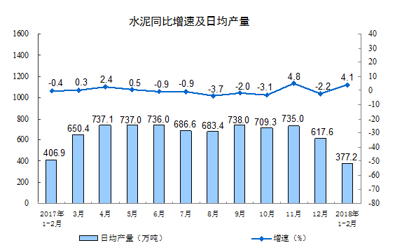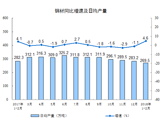 分产品看,1-2月份,596种产品中有384种产品同比增长。其中,钢材15903万吨,同比增长4.6%;水泥22256万吨,增长4.1%;十种有色金属886万吨,增长1.9%;乙烯281万吨,下降1.5%;汽车441.8万辆,下降5.0%;轿车178.8万辆,下降5.8%;发电量10455亿千瓦时,增长11.0%;原油加工量9340万吨,增长7.3%。