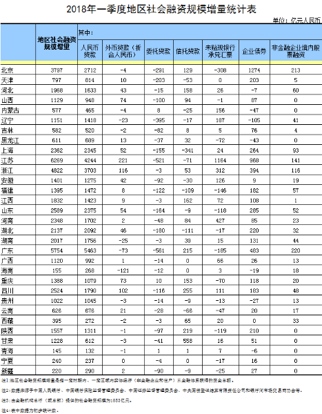 中证网讯 央行网站5月2日发布今年一季度地区社会融资规模增量统计表。数据显示,一季度江苏、广东、浙江社会融资规模增量位列前三。其中,江苏一季度社会融资规模增量为6269亿元人民币,广东一季度社会融资规模增量为5754亿元人民币,浙江一季度社会融资规模增量为4822亿元人民币。