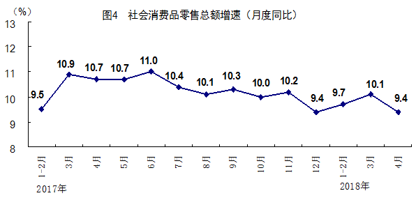 4月份,社会消费品零售总额28542亿元,同比增长9.4%,增速比上月回落0.7个百分点。按经营单位所在地分,城镇消费品零售额24528亿元,同比增长9.2%;乡村消费品零售额4014亿元,增长10.6%。按消费类型分,餐饮收入3024亿元,增长9.6%;商品零售25517亿元,增长9.4%。消费升级势头明显,限额以上单位通讯器材类、化妆品类、建筑及装潢材料类商品零售同比分别增长10.8%、15.1%和11.4%。1-4月份,社会消费品零售总额同比增长9.7%。1-4月份,全国网上零售额25792亿元,同比增长32.4%,比上年同期加快0.4个百分点。其中,实物商品网上零售额19495亿元,增长31.2%,占社会消费品零售总额的比重为16.4%;非实物商品网上零售额6297亿元,增长36.2%。