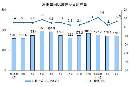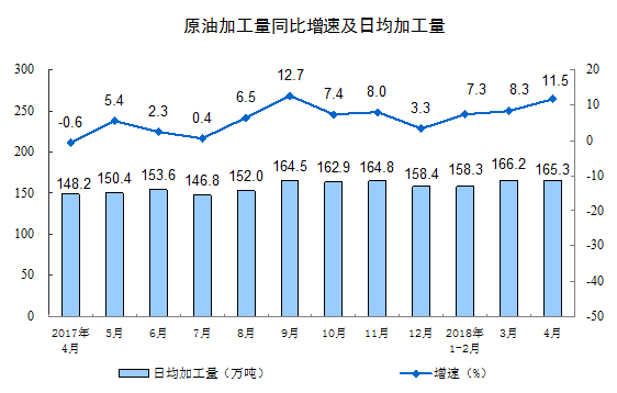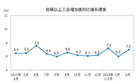 2018年4月份,规模以上工业增加值同比实际增长7.0%(以下增加值增速均为扣除价格因素的实际增长率),比3月份加快1.0个百分点。从环比看,4月份,规模以上工业增加值比上月增长0.61%。1-4月份,规模以上工业增加值同比增长6.9%。