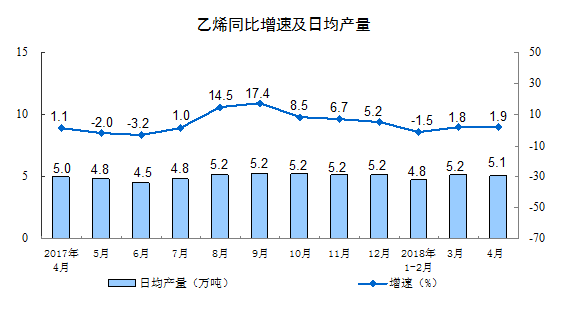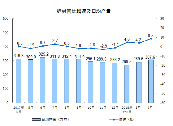 分产品看,4月份,596种产品中有396种产品同比增长。其中,钢材9227万吨,同比增长8.5%;水泥21072万吨,增长3.2%;十种有色金属454万吨,增长3.1%;乙烯152万吨,增长1.9%;汽车245.0万辆,增长10.8%;轿车100.2万辆,增长15.7%;发电量5108亿千瓦时,增长6.9%;原油加工量4958万吨,增长11.5%。
