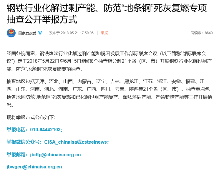 中证网讯 5月22日从国家发改委官方微博获悉,经国务院同意,钢铁煤炭行业化解过剩产能和脱困发展工作部际联席会议定于2018年5月22日至6月15日组织8个抽查组分赴21个省(区、市)开展钢铁行业化解过剩产能、防范“地条钢”死灰复燃专项抽查。