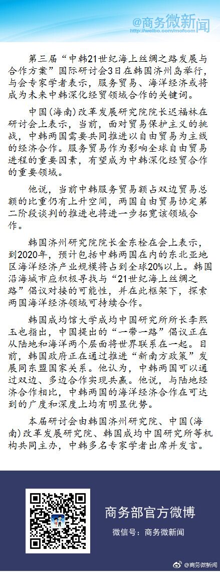 中证网讯(记者 陆静)商务部官方微博7月4日消息,第三届“中韩21世纪海上丝绸之路发展与合作方案”国际研讨会3日在韩国济州岛举行,与会专家学者表示,服务贸易、海洋经济或将成为未来中韩深化经贸领域合作的关键词。