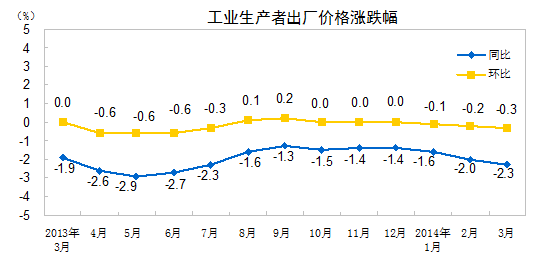 2014年3月份,全国工业生产者出厂价格同比下降2.3%,环比下降0.3%。工业生产者购进价格同比下降2.5%,环比下降0.5%。1-3月平均,工业生产者出厂价格同比下降2.0%,工业生产者购进价格同比下降2.1%。
