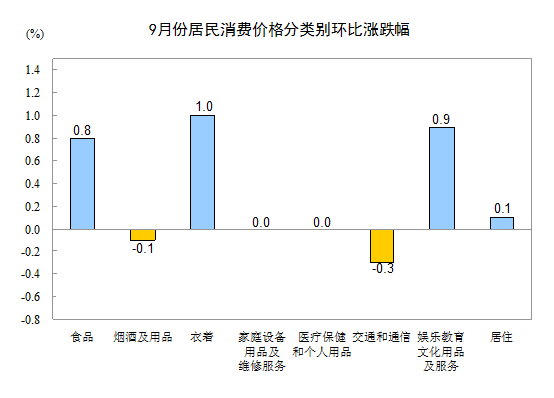 9月份,非食品价格环比上涨0.3%。其中,衣着、娱乐教育文化用品及服务、居住价格分别上涨1.0%、0.9%和0.1%;家庭设备用品及维修服务、医疗保健和个人用品价格持平(涨跌幅度为0);交通和通信、烟酒及用品价格分别下降0.3%和0.1%。