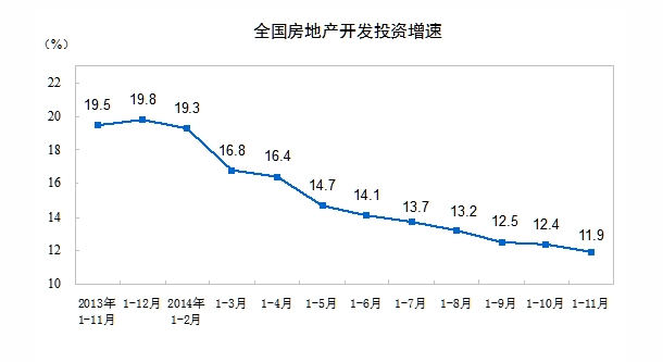 12月12日,国家统计局公布数据显示,2014年1-11月份,全国房地产开发投资86601亿元,同比名义增长11.9%,增速比1-10月份回落0.5个百分点。该增速为2009年7月份以来最低。其中,住宅投资58676亿元,增长10.5%,增速回落0.6个百分点。住宅投资占房地产开发投资的比重为67.8%。