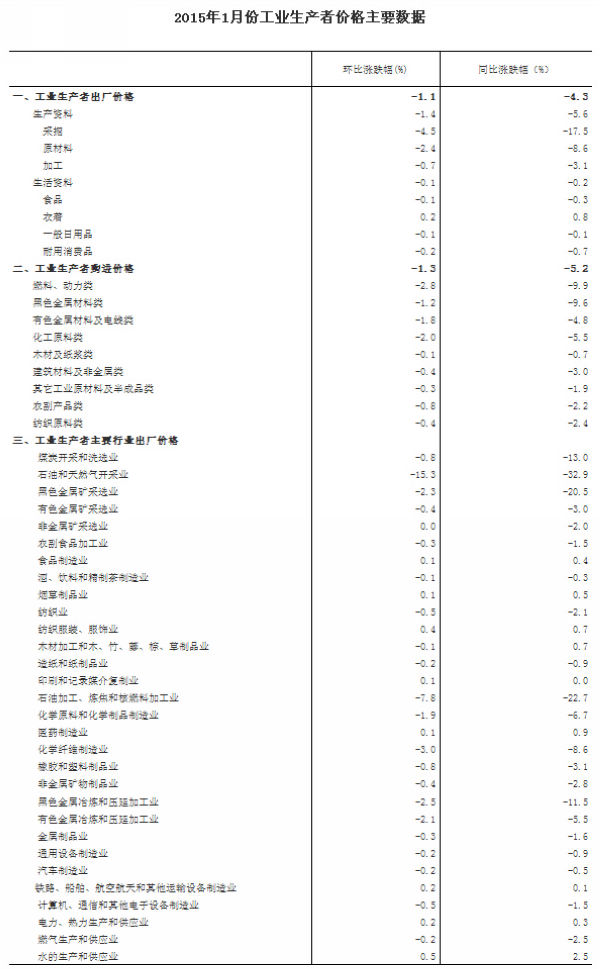 2015年1月份,全国工业生产者出厂价格同比下降4.3%,环比下降1.1%。工业生产者购进价格同比下降5.2%,环比下降1.3%。