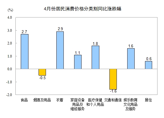 4月份,非食品价格同比上涨0.9%。其中,衣着、医疗保健和个人用品、娱乐教育文化用品及服务、家庭设备用品及维修服务、居住价格分别上涨2.9%、1.8%、1.6%、1.1%和0.6%;交通和通信、烟酒及用品价格分别下降1.6%和0.5%。