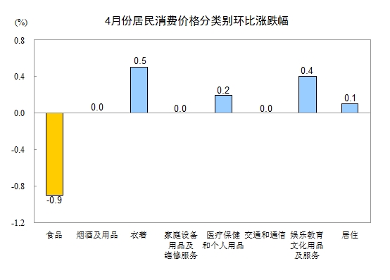 4月份,全国居民消费价格总水平环比下降0.2%。其中,城市下降0.2%,农村下降0.3%;食品价格下降0.9%,非食品价格上涨0.2%;消费品价格下降0.4%,服务价格上涨0.3%。