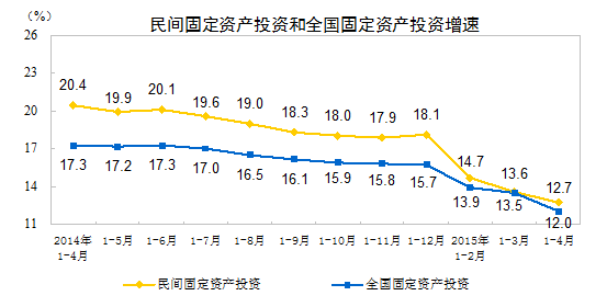 2015年1-4月份,民间固定资产投资78355亿元,同比名义增长12.7%,增速比1-3月份回落0.9个百分点。民间固定资产投资占全国固定资产投资(不含农户)的比重为65.3%,比1-3月份提高0.3个百分点。