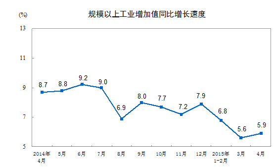 2015年4月份,规模以上工业增加值同比实际增长5.9 %(以下增加值增速均为扣除价格因素的实际增长率),比3月份加快0.3个百分点。从环比看,4月份,规模以上工业增加值比上月增长0.57%。1-4月份,规模以上工业增加值同比增长6.2%。